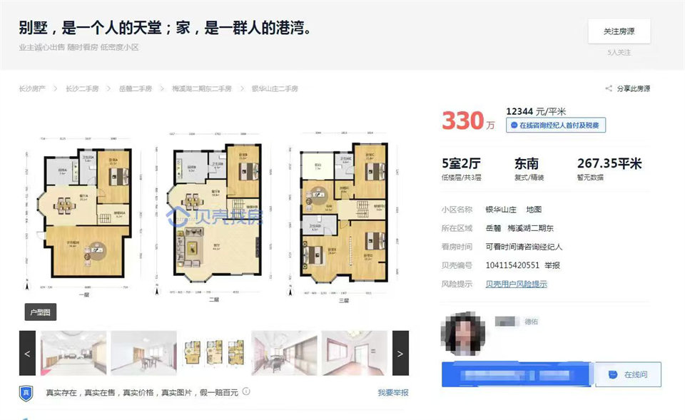 銀華山莊,精裝修雙拼別墅,產(chǎn)權(quán)267平,實(shí)際面積可能有5-600平,有大花園,有大車庫,雙一樓入戶,雙一樓都能停車,還看小區(qū)池塘景觀,位置也還不錯,開車到步步高梅溪湖新天地只要幾分鐘。