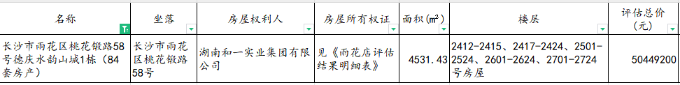 因湖南和一實業(yè)集團有限公司破產(chǎn)重整需要依法拍賣處置的相關(guān)資產(chǎn):長沙市雨花區(qū)桃花鍛路58號德慶水韻山城1棟(84套房產(chǎn)), 具體為2412-2415、2417-2424、2501-2524、2601-2624、2701-2724號房屋。以上資產(chǎn)的詳細(xì)清單及其價值請參見國眾聯(lián)資產(chǎn)評估土地房地產(chǎn)估價有限公司湖南分公司關(guān)于對湖南和一實業(yè)集團有限公司名下位于長沙市雨花區(qū)桃花鍛路58號德慶水韻山城1棟房地產(chǎn)市場價值(補充)評估說明書及相應(yīng)的《評估結(jié)果明細(xì)表》。